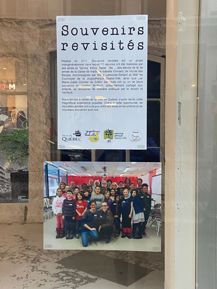 560, rue Saint-Joseph EstSouvenirs revisités, un projet intergénérationnel entre les enfants de l’école des Berges et le Service amical Basse-Ville Réalisé en 2017, Souvenirs revisités est un projet intergénérationnel dans lequel 11 œuvres ont été réalisées par des aînés du Service amical Basse-Ville et des élèves de la 3e année de la classe de madame Isabelle Grimard, de...